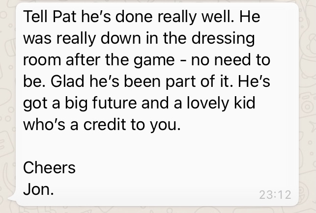 It was a lovely message to get. Since then, he’s been asked to go training with the u18’s development team but that’s another story.