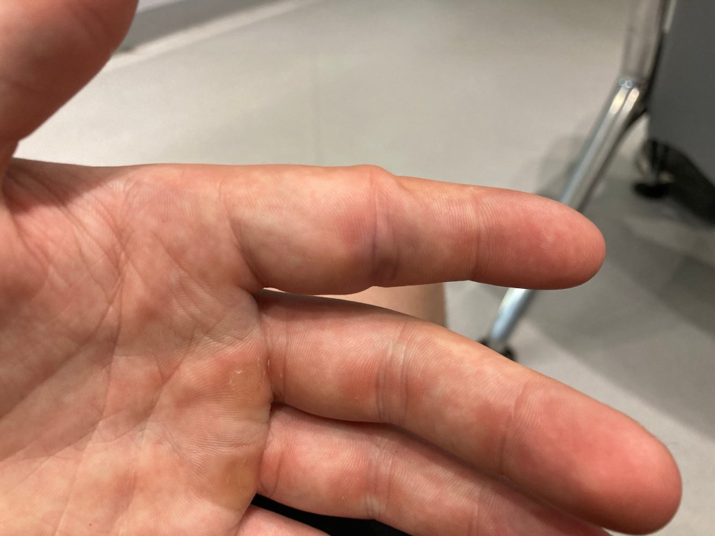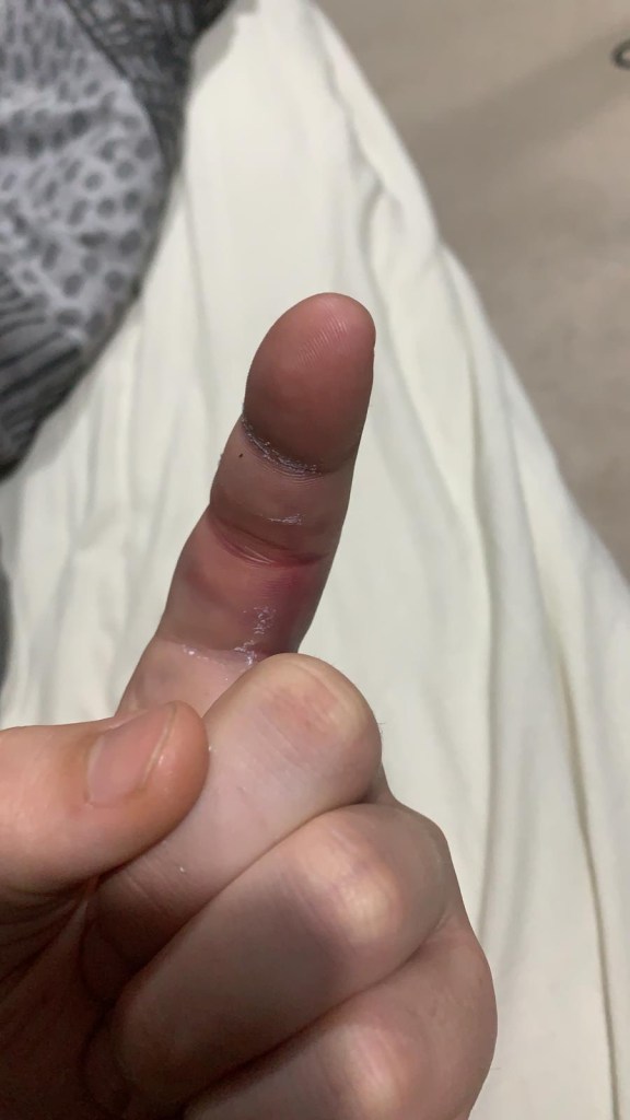 Pat had to go back to hospital to the Hand Clinic the following day where they gave him a compression dressing, some exercises to do to help it heal and also said that as well as dislocating his finger, he’d fractured it as well. Estimated recovery time was anything up to 6 weeks depending on how well the swelling went down.